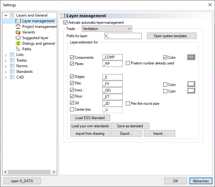 By activating the automatic Layer Management, it is possible to view individual system components on predefined layers with prefix and suffix digits. These settings are saved in the drawing and can be used on all new constructions.