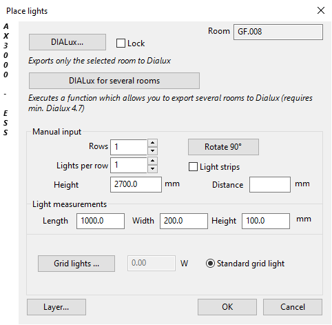 After activating the function, pick the room symbol or define the area where the lamps should be set. Following Dialogue opens:
